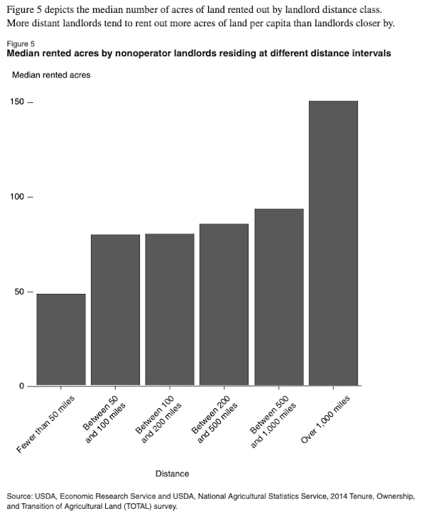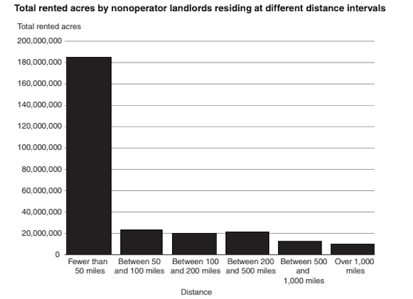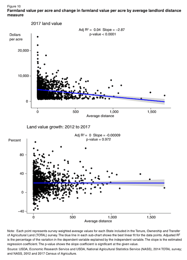 Impact on rental rates and farmland values: Analyzing farmland rental rates and land values between 2012 and 2017, the study shows that both measures tend to be associated with landlords who, on average, live farther from their lands, as well as a higher percentage of absent landlords. USDA notes that landlord absenteeism explains a larger portion of the variation in States’ farmland values in 2017 then in rental rates. Interestingly, the analysis finds no correlation between landlord distance with the growth in rental rates nor the growth in farmland values from 2012 and 2017, suggesting that absent landlords aren’t contributing to these changes.