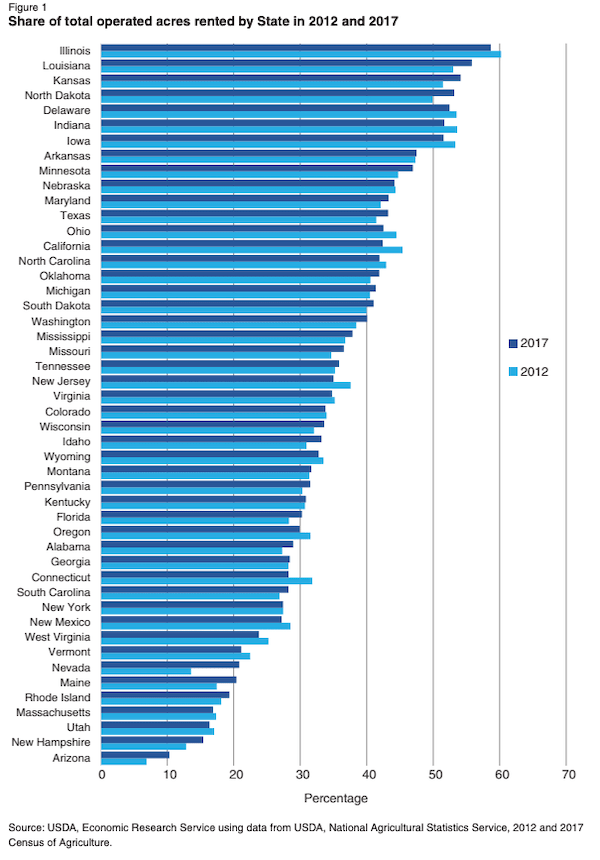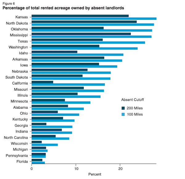 USDA recently published a study analyzing the impact of absent farm landlords on the long-term economic and agricultural health for the 25 most important farm States by cash receipts. Interestingly, the study finds a greater prevalence of absent landlords is associated with lower rental rates and land values at the State level, but there appears to be no correlation with changes in rents and land values.