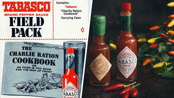 From Air Force One to Space: One-eighth-ounce bottles of Tabasco, bearing the presidential seal, are served on Air Force One. During the Vietnam War, Brigadier General Walter S. McIlhenny issued The Charlie Ration Cookbook that came wrapped around a wo-ounce bottle of Tabasco sauce in a camouflaged, water-resistant container. The US military has included Tabasco sauce in Meals, Ready-to-Eat (MREs) since the 1980s. The Australian, British, and Canadian armies also issue small bottles of Tabasco sauce in their rations. McIlhenny is one of just a few U.S. companies to have received a royal warrant of appointment that certifies the company as a supplier to Queen Elizabeth II. Tabasco also appeared on the menu of NASA’s Space Shuttle program and went into orbit on the Shuttles. It was on Skylab and on the International Space Station and is popular with astronauts as a means of countering the bland food they have in space. (Sources: New York Times, Taste Atlas, Wikipedia)