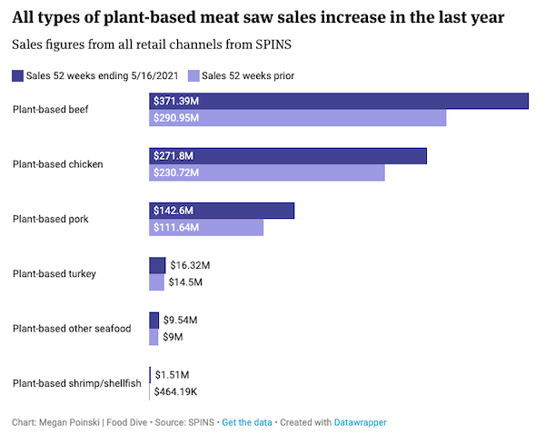 Jeff Crumpton, a SPINS retail business consultant, says chicken alternatives are the second most consumed plant-based meat product category today, behind faux-beef burgers. Nuggets are the top seller, with plant-based alternative sales climbing almost +50%. Sam Terris, co-founder and chief operating officer of plant-based chicken company Simulate, explains, “I think you can kind of convince anyone to eat a plant-based chicken nugget…whereas if you’re trying to simulate filet mignon, people have these kind of extremely high expectations.”