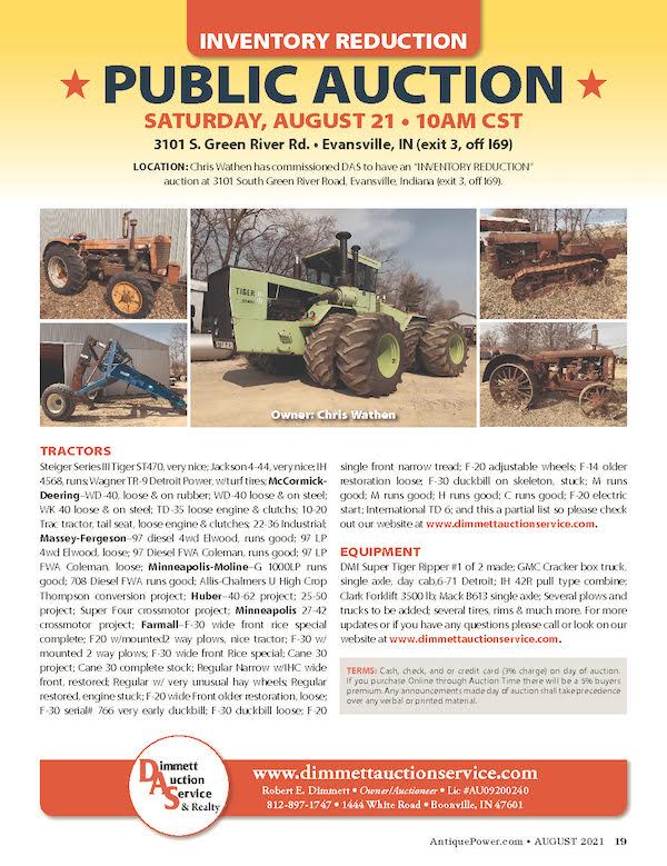 Wathen owned over 50 collector tractors in 2018 including everything from Steiger, Big Bud, Versatile, Wagner, International Harvester, Case IH, Allis-Chalmers, FORD, Oliver, Minneapolis-Moline, CO-OP, Jackson, Coleman, and homemade tractors such as Wampascat, Brute, Euctor, and many more machines. Keep in mind, since 2018, the collection has grown even larger! Click HERE to watch a video put on Big Tractor Power about Wathen’s collection. It’s worth noting, this auction will also include a 1934 McCormick-Deering I12, Minneapolis-Moline G1000, and a Massey Ferguson 97. Click HERE to see the full auction! (Source: Tractor Zoom, Dimmet Auction Service, & Ryan Roossinck)
