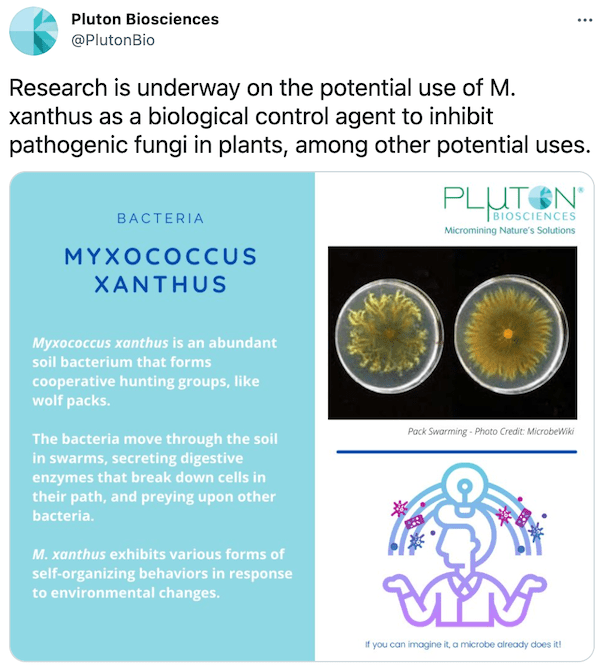 A new company called Pluton Biosciences is using technology that is able to quickly and inexpensively tap into the diverse world of bacteria, fungi, and viruses in our fields to discover next-generation products for agriculture, pesticide, bioremediation, energy, and pharmaceutical industries. It can discover novel microbes to use in new natural products in months, not years, at a fraction of the cost expended by current laboratories.