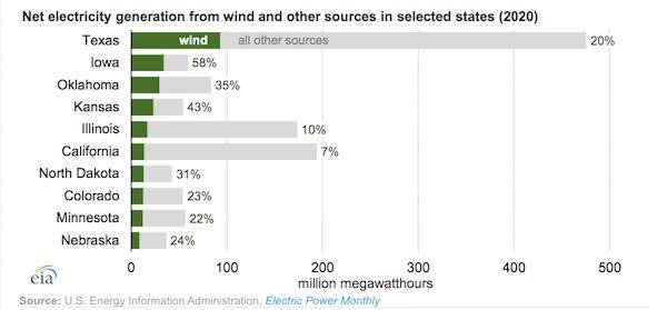 More than 16,000 megawatts of U.S. wind power-generating capacity was installed in 2020 making it a record year. This is also the first time wind power developments outpaced solar power installations, culminating in $24.6 billion in investment across 25 states. Currently, sixteen states get more than +10% of their electricity from land-based wind generation with some in the midwest like Iowa, Kansas, Oklahoma, South Dakota and North Dakota getting more than +30%.