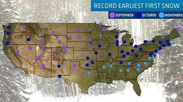 A bunch of cities form the Midwest to the Great Lakes and Northeast have received their record first accumulating snow in October.