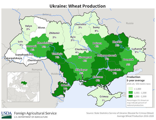 Ports – Ukraine, Russia, Kazakhstan, and Romania all ship grain from ports in the Black Sea. Most of Ukraine’s grain exports ship from the Black Sea port cities of Mykolaiv and Odessa, which lie west of the Crimean Peninsula. Some analysts worry that Russia could push westward into Ukraine, cutting off access to the ports and leaving the rest of Ukraine landlocked. This could potentially disrupt shipments from other Black Sea shippers as well. There is also the worry that an armed conflict could damage port infrastructure and paralyze shipments out of the Black Sea altogether. (Sources: USDA, Argus, Bloomberg)