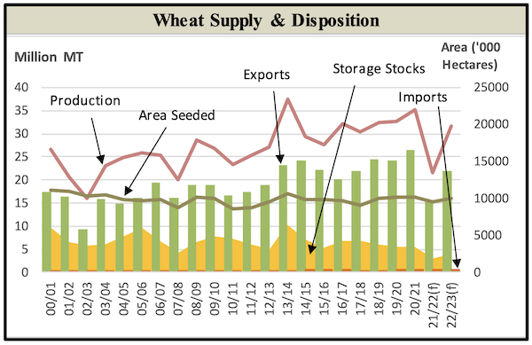 Production of wheat in 22/23 is seen rebounding partially on a projected increase in planted area to both spring and durum wheat. FAS notes that planting decisions will ultimately be guided by canola disease pressures, dry planting conditions, high input prices, and high wheat prices, all of which favor increased wheat planting relative to alternative crops such as canola.