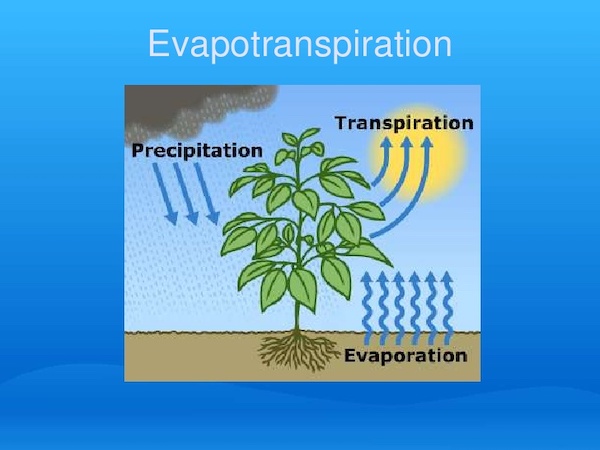 Evapotranspiration is the loss of water from the soil both by evaporation from the soil surface and by transpiration from the leaves of the plants growing on it. Factors that affect the rate of evapotranspiration include the amount of solar radiation, atmospheric vapor pressure, temperature, wind, and soil moisture. Evapotranspiration accounts for most of the water lost from the soil during the growth of a crop.