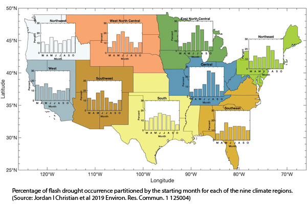 A recent study supported by the National Oceanic and Atmospheric Administration (NOAA) and US Department of Agriculture (USDA) found that between 1979–2016, flash droughts in the western US occurred more frequently in May and June, with the Northwest climate region seeing an additional peak at the end of the growing season. In contrast, flash drought frequency across the central and parts of the eastern US peaked in July and August. The frequency of flash drought in the Southeast region generally peaked in May. For all climate regions, flash drought intensity tended to increase toward the beginning of the growing season and then decrease. In general, regions that undergo seasonal swings in humidity – such as Southeast Asia, the Amazon Basin, and the East Coast and Gulf Coast of the United States – tend to be flash drought hot spots.