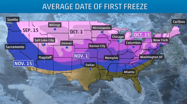 September 15: The average first freeze occurs sometime around Sept. 15th for much of the Rockies and Intermountain West as well as parts of the northern Plains and upper Midwest (closer to the international border). Additionally, some inland areas of the upper Great Lakes also see their first freeze around Sept. 15th each year. It’s also worth noting, western Wyoming, western Montana, Idaho, and eastern Oregon will see their first freeze before Sept. 15th as of late. Keep in mind, last year Denver didn’t see its first freeze until Oct. 13th, but it was as early as Sept. 8th in 2020.
