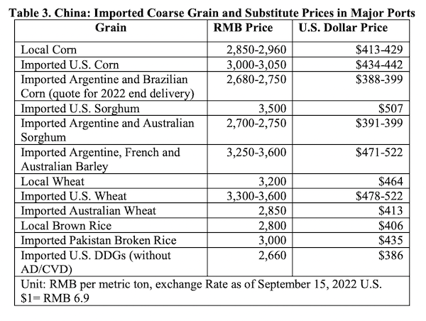 As for China’s corn imports in 22/23, USDA’s Post has them pegged at 18 MMT and estimates 21/22 corn imports at 22 MMT, the same as USDA’s official estimate. That’s despite the fact that feed corn and residual use is forecast +2 MMT higher than USDA’s current estimate as feed mills add more corn over wheat, which Post notes was +$44 per MT more expensive than corn. Feed mills reported using +35% more corn in feed rations during the first eight months of 2022, +4% higher than 2021.