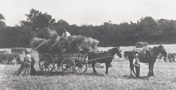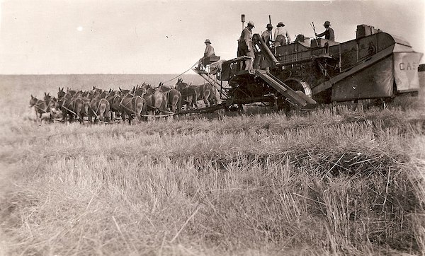 The full wagons were transported to the thresher which was typically placed at a central harvest site to reduce travel time. Threshers were first run by horses walking in circles, and later by steam engines. Wheat was pitched inside the thresher, which separated the kernels from the head. The kernels then came back out of the machine in one spot, the straw and chaff came out another. So-called “sack-jigs” filled burlap sacks with grain, which they then passed to “sack sewers,” who literally sewed the sacks closed. Meanwhile, a “straw-buck” would place the straw into a wagon and haul it away. It took about 6 people to man a thresher, which also had to be constantly serviced. In total, a full wheat harvest crew was about 30 men and 30 horses.