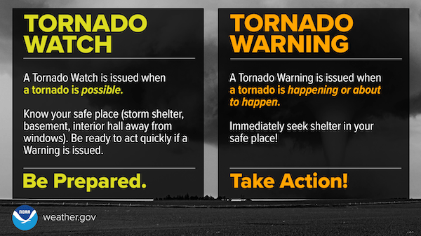 Tornado safety begins with understanding the difference between Tornado Watch and a Tornado Warning issued by the National Weather Service (NWS):