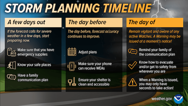Be Weather-Ready: Check the forecast regularly to see if you’re at risk for tornadoes. Listen to local news or a NOAA Weather Radio to stay informed about tornado watches and warnings.