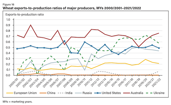 Exports-to-production ratios for the United States were fairly stable from MY 2000/2001 to MY 2006/2007, increasing from 2006/2007 to 2007/2008 and then sharply declining in 2008/2009 to 0.40. From 2010 to 2015, the United States’ propensity to export trended downward, reaching a low of 0.37 in 2015 in part due to U.S. wheat exports declining to 21.2 million metric tons. More recently, the U.S. propensity to export wheat slightly declined from 0.54 in 2020 to 0.49 in 2021. Australia had the highest export propensity in 2021 with a ratio of 0.76.