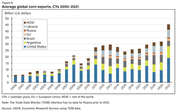 Corn: Corn has been the leading U.S. crop in terms of production and acreage and is second only to soybeans in terms of export value. The U.S. also remains the world leader in corn exports, though competition from Brazil, Argentina, and Ukraine has increased in the last decade. U.S. corn exports were valued at over $9.2 billion in calendar year (CY) 2020 and $18.7 billion in CY 2021. The +100% increase over 2020 is partly attributed to strong feed demand in China and the Phase One agreement. U.S. corn represents a large share of the corn imported by China, Japan, South Korea, Mexico, and Colombia—all countries with a U.S. trade agreement in place.