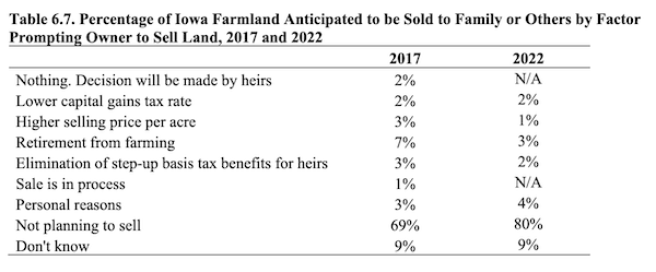 The report notes that all these trends have significant implications for when and how farmland is intended to be transferred to the next generation. Willing or giving the land to family remained the most popular method of intended land transfer, accounting for 47% of all acres of Iowa farmland. The second-most popular intended method of land transfer was putting it into a trust or in a business entity, covering 26% or 12% of land, respectively. Only 4% of Iowa farmland was intended to be sold to a non-family member. When asked about what factors will prompt a landowner to sell some of their farmland, 80% of the land is owned by someone not planning to sell. In other words, we will continue to see a tight farmland supply. The full report is available at HERE. This is great work by the folks at Iowa State University!