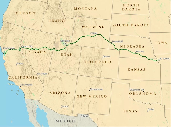 To meet its guarantee of 10-day delivery of mail (letters and newspapers only) from St. Joseph to San Francisco, the company required its horses to be ridden at top speed. The horses, therefore, could not run a great distance and had to be changed every 10–15 miles at the strategically placed relay stations. The route they traversed was over 1,966 miles, stretching across the Kansas plains, into Nebraska, along the Platte River and through the Rockies, into the valley of the Great Salt Lake, across the Nevada deserts, and then over the Sierra Mountains. After finally arriving in the Sacramento Valley, the mail was then carried by steamboat to San Francisco.