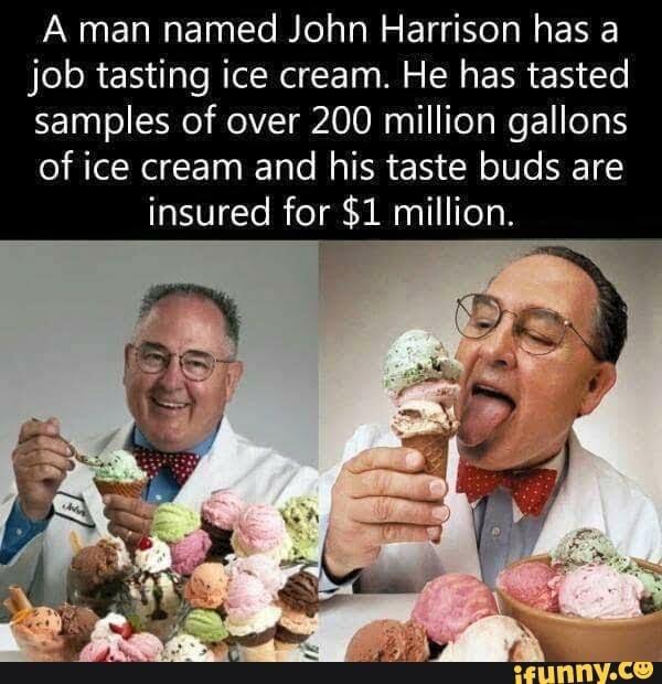 Million-Dollar Insured Tongue – Dreyer’s Grand Ice Cream Inc. insured taste tester John Harrison’s tongue for a million dollars back in the 1990s. In case you’re wondering, the premiere taster would start with the white wines of ice cream, vanilla, French vanilla and work his way up to the Bordeaux of fudge, using lukewarm water or an unsalted cracker as a palate cleanser. I’m told of the 40 million gallons of ice cream produced by the company back then, about 100,000 gallons were rejected by Harrison.