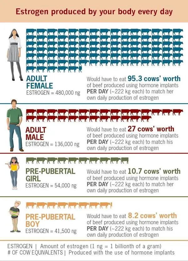 4. An adult female would have to eat 95.3 steers’ worth of beef per day (483 pounds each) to match her own daily production of estrogen.