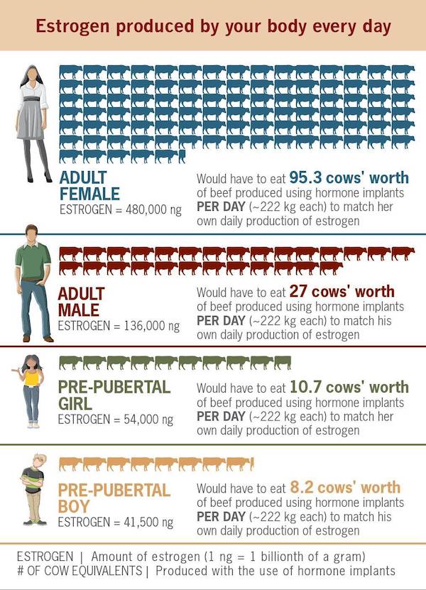 This was sent my way the other day and I thought I would share. I did some digging and found it was written by Amanda Radke over at BEEF Daily the full article is titled “Hormones by the numbers: Stats to share with consumers”. I encourage you to read the full blog post. Below is a brief excerpt along with some interesting graphics.