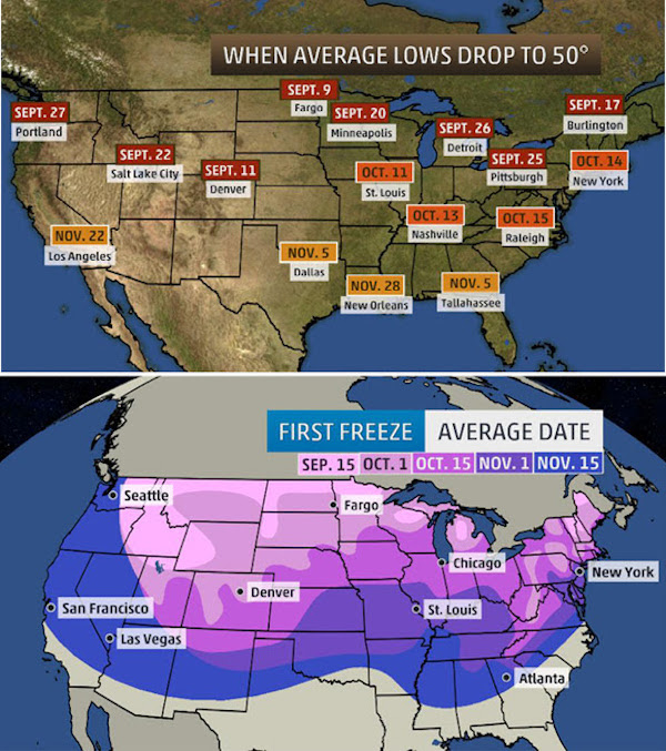 Below you will find some guesstimates, the maps show the date when selected cities see their average low-temperature first dip to 50 degrees or lower. Of course for producers, talk of low temperatures quickly brings the conversation to early-freezes. The second map shows the average date of first freezes around the country. Keep in mind that these are simply average dates.