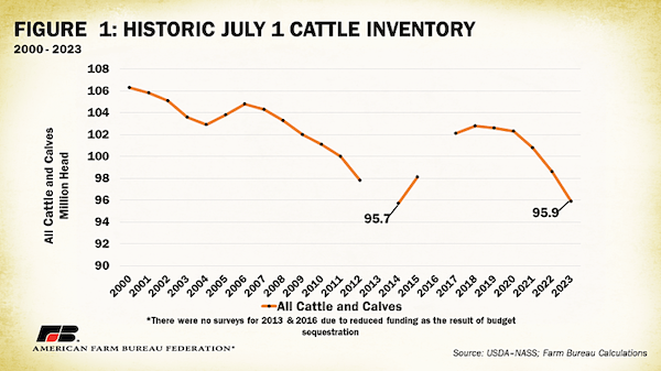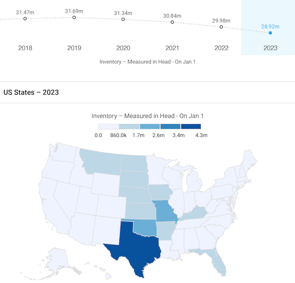 The previous cattle inventory low came amid the 2011-2013 drought that pushed the cattle herd to the smallest since 1952. A 7-year liquidation of the national cattle herd ended on January 1, 2014, at 88.2 million cattle and calves. The cattle herd peaked at 103 million head in July 2020. The USDA’s most recent Cattle Inventory Report report showed all cattle and calves in the US totaled 95.9 million head as of July 1, 2023, down nearly -3% from July 2022. Most think the herd will shrink further before the expansion process begins, though there is still heavy debate as to whether the 2014 low will be avoided.