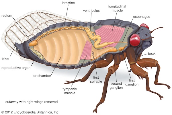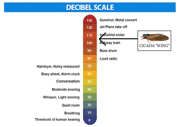 The Cicada SoundAll cicadas produce sound by vibrating a membranous, drumhead-like organ on the sides of their abdomen called a tymbal. The tymbal has a series of ribs that can buckle onto one another when the cicada flexes its muscles. As each rib buckles, it creates a clicking noise, and the combined effect of the clicks is the buzzing sound we hear. The enlarged and mostly hollow abdomen of the cicada acts as an amplification chamber producing vibrations of more than 100 decibels, one of the loudest sounds in the animal world.