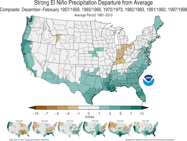 The benchmark for a strong El Niño winter has been that experienced during the winter of 1997-98 and 2015-16. With most in the row-crop industry desperately trying to predict how the weather pattern will develop and play out during the upcoming winter and next growing season, I thought including some information about how the two most recent and strongest have played out.