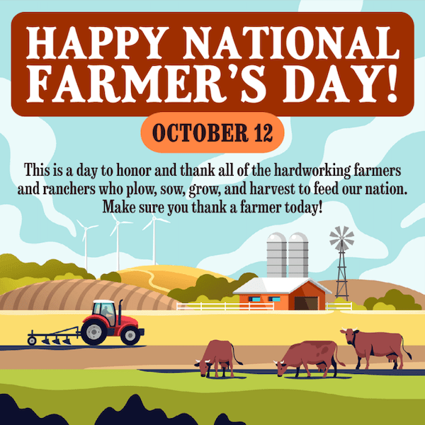 Farmers Day is celebrated every year on October 12! The profession of farming began around 12,000 years ago with the domestication of livestock as hunter/gatherers settled down and started to plant their own food.