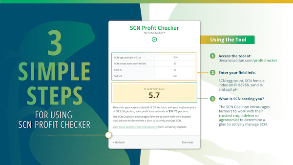 The SCN Coalition says the first step in actively managing SCN is knowing what you have in your fields. Once detected, the nematodes will always be there to some degree, but you cannot effectively manage a persistent pest like SCN if you’re unaware that it’s present. “Once you receive your soil test result, use the Coalition’s new SCN Profit Checker tool to get a yield- and profit-loss estimate,” says Mangel. “This tool puts in dollars and cents what SCN is costing farmers on a per-field basis.”