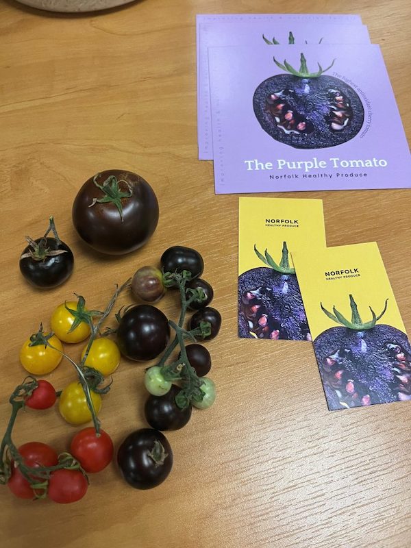 Developed by Norfolk Plant Sciences founder, Professor Cathie Martin, the purple tomato derives its color from two genes sourced from the edible snapdragon flower. The compounds responsible for giving purple coloration to flowers, produce, and other plants are known as “anthocyanin,” bioactive compounds that have a number of unique health benefits associated with them.
