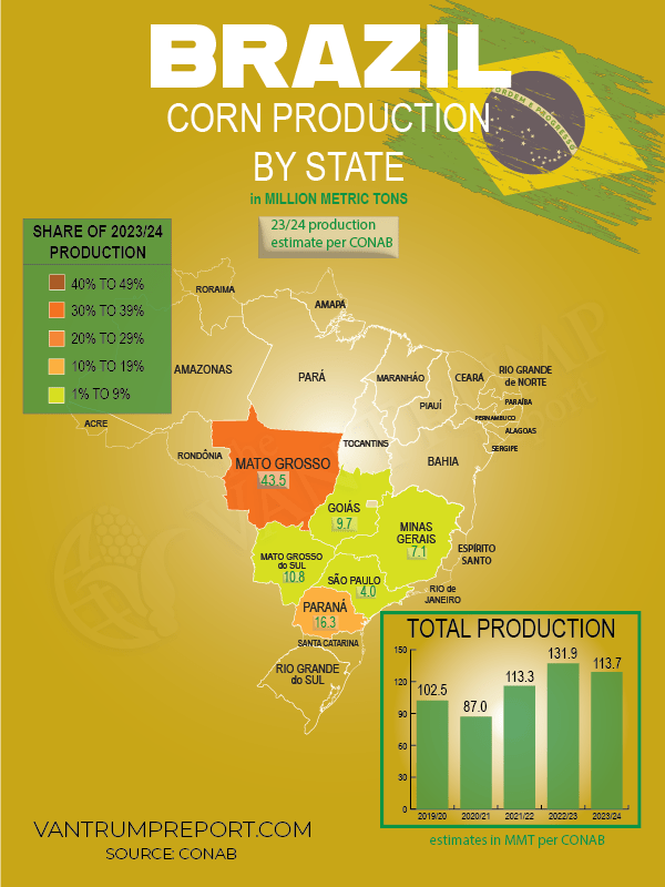 Conab in early February cut its first crop corn harvest estimate by -3.2% to 23.6 million metric tons. That’s down -13.8% compared to 2022-23 thanks to “adverse situations such as high rainfall in the south of the country and low rainfall in the center-west, accompanied by high temperatures, among other factors”, Conab said.