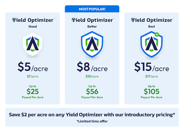 Yield Optimizer, with the associated Yield Gap protections, is available in a three-tiered offering with introductory pricing at $5.00, $8.00, or $15.00 per acre. The respective Yield Gap protection payments for these prices are up to $25, $56, or $105 per acre. Farmers can sign up during the early sign-up period with introductory pricing valid until March 15. Sign-up will continue at standard prices after this date. Learn more about Yield Optimizer and Yield Gap protections HERE.
