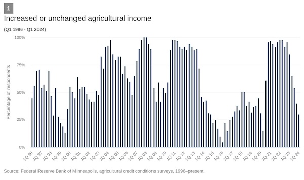 I’m worried about farmland prices if real interest rates stay higher for longer and crop prices drift back down to pre-Covid levels (i.e. corn sub-$4.00, soybeans sub-$10, wheat sub-$6). I’m not saying this will happen for certain, but if it does I have to imagine it heavily weighs on farmland prices. The good news (perhaps I should say kind of good news) is the fact we have more and more buyers entering the space and creating increased demand for farmland. That’s not good news, however, if you are looking to be a buyer, but the increase in overall demand by those looking to purchase land for solar farms, data centers, housing developments, and pension funds adds another layer of support underneath the farmland market. In other words, there are a lot more buyers of farmland for various reasons than at any point in history. These additional buyers not only drive prices higher but can also help soften the blow when the market pulls back. Below is what some of the regional Fed Banks are reporting. Recent updates from regional Federal Reserve banks highlight the challenging conditions US farmers face this year amid lower crop prices, high operating costs, and tight credit. The three Fed districts that cover the major US crop growing regions include the Chicago Fed, which covers the 7th District (Illinois, Indiana, Michigan, and Wisconsin); the Minneapolis Fed serves the 9th district (Minnesota, Montana, North and South Dakota, 26 counties in northwestern Wisconsin, and the Upper Peninsula of Michigan); while the Kansas City Fed serves the 10th District (Missouri, Nebraska, Kansas, Oklahoma, Wyoming, Colorado, and northern New Mexico). All three regional Fed banks say falling farm income has led to an increase in demand for loans. The banks also highlighted the strength of the cattle market as an exception to overall low commodity prices. The Kansas City Fed noted that credit conditions in Q1 2024 tightened comparatively more in states with greater reliance on crop revenues and less in more cattle-heavy areas, a trend witnessed across the other two districts as well. The Chicago Fed’s Ag Letter is available HERE; the Minneapolis Fed Ag Credit Conditions Survey is HERE; and the Kansas City Fed Ag Credit Survey is HERE. Below are some other highlights: Farm Income and Credit Conditions: Bankers surveyed in all three ag districts indicate that farm incomes fell further in the first quarter of the year as loan demand climbed. The KC Fed says as lenders entered the renewal period for annual operating lines, loan denials were very limited but many reported an uptick in carryover debt and loan restructuring to meet liquidity needs. All three districts have seen increased demand for non-real-estate loans relative to a year ago while the availability of funds declined. Collateral requirements have also increased at many agricultural banks across all three districts. There has also been a small decline in repayments reported by ag banks as falling incomes continue to stretch budgets. Land Values and Cash Rents: Farmland values and cash rents were up across all three Fed districts in Q1 2024, though the gains varied. 7th: The Chicago Fed notes that the +4% year-over-year increase in 7th district farmland values was the smallest since Q3 2020. Adjusted for inflation, the year-over-year gain in 7th District farmland values for the first quarter of 2024 was just above +1%, marking the 16th consecutive quarter of real year-over-year growth. The Chicago Fed also noted that survey participants said the share of acres purchased by farmers was down relative to last year, “implying that the share of acres purchased by investors was edging up in parts of the District.” Cash rental rates for District farm acres increased by +2% percent from 2023 to 2024, which was the fourth positive yearly change in a row. However, after being adjusted for inflation with the Personal Consumption Expenditures Price Index (PCEPI), District cash rental rates were actually down -1% in 2024 from the previous year. Nearly 60% of 7th District ag bankers considered farmland to be overvalued. Even so, responding bankers generally expected farmland values to be unchanged in the second quarter of 2024: 7 percent of these bankers forecasted agricultural land values to increase, 76 percent forecasted them to be stable, and 17 percent forecasted them to decrease. |