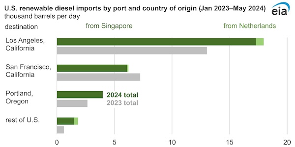 In the first five months of 2024, U.S. imports of renewable diesel averaged 30,000 barrels per day (b/d), up nearly +30% from 2023 May 2023. Most of the imports (94%) were destined for the U.S. West Coast. Those imports all came from Neste’s plants in Singapore and Rotterdam, according to the US Energy Information Administration (EIA). Additionally, EIA data shows imports accounted for 20% of U.S. consumption of biomass-based diesel from January through May. That’s up from a market share of 15% for the same period in 2023 and 10% in 2022.