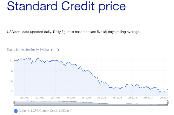 However, prices for the state’s carbon credits have plunged from as high as $200/ton in 2018 to around $50/ton in mid-August 2024. This is blamed on a steep increase of biomass-based diesel that critics say has left the carbon credit market oversupplied. Plunging credit prices in turn reduce the incentive for producers and end-users alike to seek out even lower carbon alternatives, according to critics.