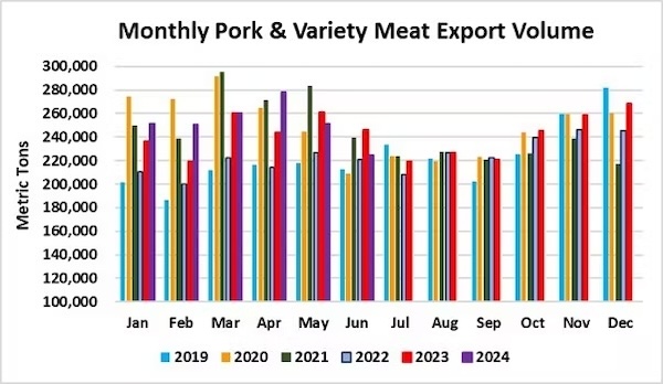 The good news is that total exports for 2024 are expected to be 7.1 billion pounds, less than initially forecast but still about +4.4% higher than last year. USDA says the reduction reflecting the assumption that demand for U.S. pork by important importing countries will be somewhat slower than initially projected earlier this year. USDA pegs pork exports in the third quarter at 1.64 billion pounds, about +6.6% higher than Q3 2023, while fourth quarter exports are forecast to run around +5% higher than last year at just under 2 billion pounds. If USDA’s estimates are realized, pork exports will account for more than a quarter of commercial pork production this year. USDA’s estimate for 2025 pork exports is about 7.4 billion pounds, +3.4% above projected 2024 exports.