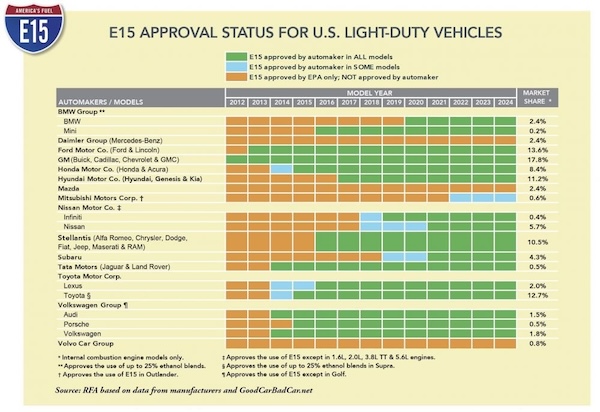 The key issue with E85 is that many agencies recommended it only to be used by Flex Fuel Vehicles (FFV), and car makers have recently been focused on EVs, so there aren’t a ton of models that should “technically” be using the fuel – the Department of Energy maintains a list HERE, if you’re interested. On the flip side, approximately 96% of the vehicles on the road today, roughly 290 million, are legally approved to use E15. In fact, E15 is fully approved for use in cars, SUVs, pickups, vans, or other light-duty vehicles manufactured after the year 2000. By comparison, there are some 22 million flex-fuel vehicles (FFVs) on the road in the United States, roughly just 8% of all vehicles. (Sources: Renewable Fuels Association, Ethanol Producer, AgWired, DOE)