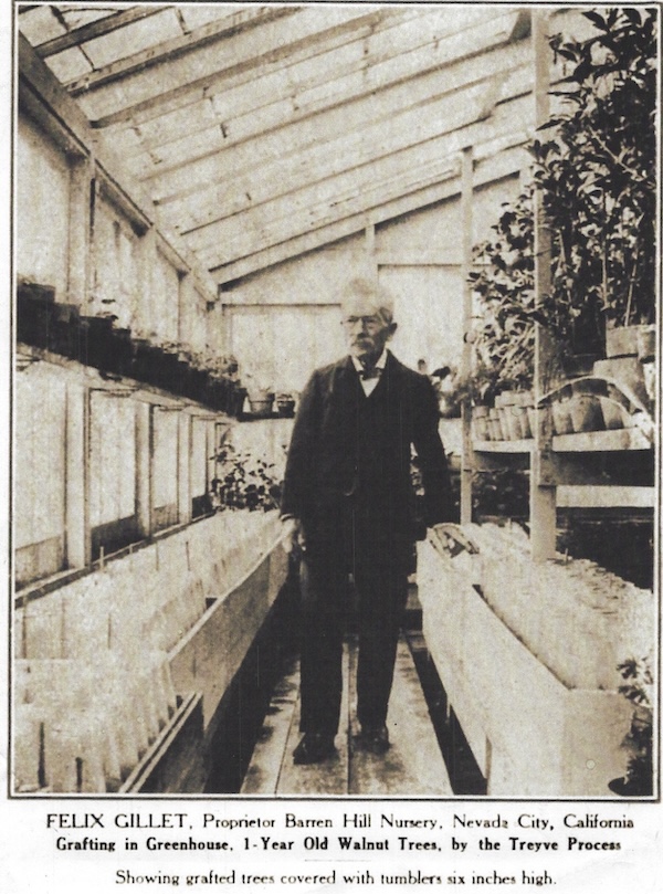 The Felix Gillet story is perhaps even more impressive. Gillet was a French sailor who immigrated to Boston, MA in 1852. Then made the long journey West ending in California in 1958. Initially, he opened a barbershop. He struggled with the business and caught a ship back to France in 1962. Once back home he went to work for a plant nursery. A couple of years later after catching the passion for the nursery and plant business, it struck him that California might really need something like this. He came back to the U.S. and in 1870 with about $250 in gold coins purchased 16 acres of land just outside town in Nevada City, CA and started establishing a farm and plant nursery that he would call the “Barren Hill Nursery”, becoming one of the first fruit and nut nurseries on the west coast of the United States.
