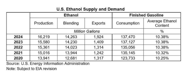 The latest data from the Energy Information Administration show U.S. ethanol production hit a record 16.22 billion gallons (bg) in 2024, spurred by rising domestic consumption and record exports of 1.92 bg, according to the Renewable Fuels Association (RFA). Domestic usage increased to 14.26 bg, the highest level since 2019, reflecting the continued expansion in the number of retail stations offering E15, together with waivers by the Environmental Protection Agency allowing E15 to be sold year-round, says RFA.