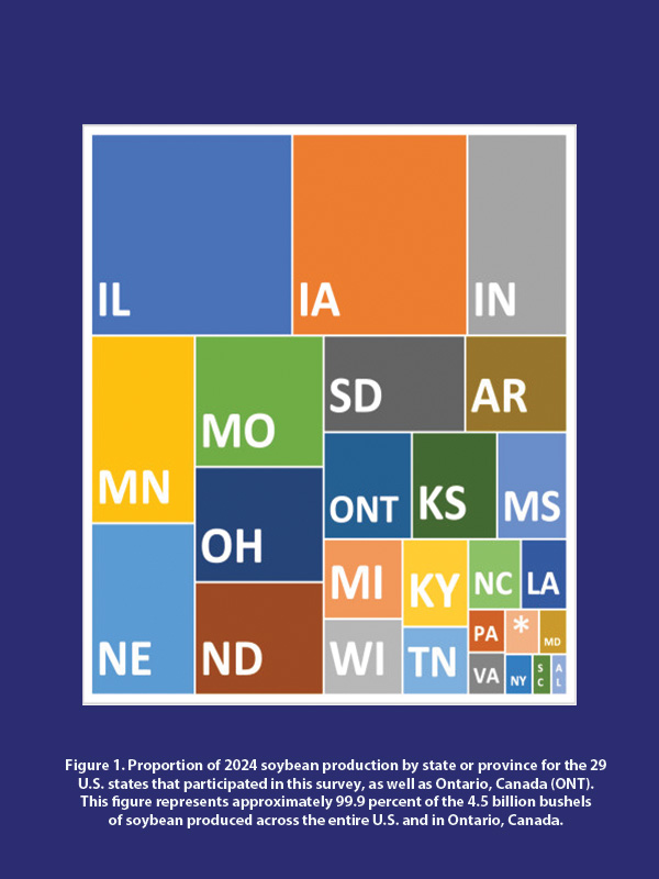 Soybean Disease Loss Estimates – Extension, university, USDA plant pathologists, and/or soybean specialists from major soybean-producing areas in the United States and Ontario, Canada provided the estimates. These reports accounted for 99.9 percent of the total soybean production in the United States and 100 percent of production from Ontario in 2024. The full report is HERE. The United States produced nearly 4.4 billion bushels of soybean in 2024, which is 233.6 million bushels greater than the average of the previous five years. Ontario, Canada, produced 160.0 million bushels in 2024. In all, an estimated 5.4 percent (250.9 million bushels) of the potential soybean production in 2024 was lost due to disease in the 29 soybean-producing U.S. states, and 5.7 percent (9.6 million bushels) of the total soybean production in 2024 were estimated to be lost due to disease in Ontario, Canada. The 2024 estimated losses from soybean disease in the U.S. are the fifth lowest observed out of 29 years of available data, with only 2019, 2020, 2022, and 2023 being lower. In Ontario, 2024 yield losses were nearly the same as in 2023 but were approximately 2.3 million bushels less than the average of the previous five years. The northern states in the U.S., which include Illinois, Indiana, Iowa, Kansas, Michigan, Minnesota, Nebraska, New York, North Dakota, Ohio, Pennsylvania, South Dakota, and Wisconsin, accounted for 76.4% of the total estimated U.S. yield losses in 2024. A trend of reduced estimated losses due to soybean diseases continued in 2024, with an estimated 191.6 million bushels lost vs. an average of 348 million bushels from 1996 through 2018. Dry conditions in certain soybean production areas in 2024, and in the previous four years, likely resulted in less disease loss than typically observed in the northern region. There were no foliar diseases among the top yield-reducing diseases in 2024 for the northern region. Similar to what was observed in the previous two years, soybean cyst nematode and root-knot nematode caused the most estimated yield losses in 2024 in the southernmost U.S., which includes Alabama, Arkansas, Delaware, Florida, Georgia, Kentucky, Louisiana, Maryland, Mississippi, Missouri, North Carolina, Oklahoma, South Carolina, Tennessee, Texas, and Virginia. Soybean cyst nematode, sudden death syndrome, and Sclerotinia stem rot caused the greatest estimated yield loss in Ontario, Canada, in 2024. |