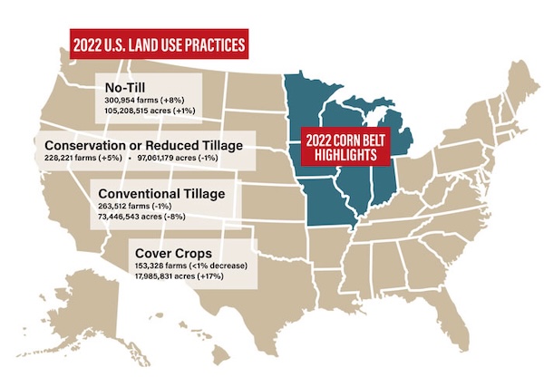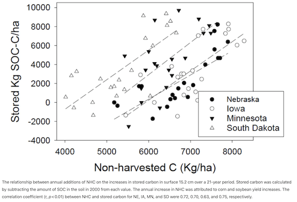 Expanding the research to other states and utilizing over 12 million soil samples South Dakota, Minnesota, Iowa, and Nebraska, the team says farmers in these states have stored approximately 1.24 billion metric tons of carbon in the six inches of surface soil over the 21-year period. Within the four-state region that tillage intensity decreased, corn and soybean yields increased +63 and +33%, respectively.